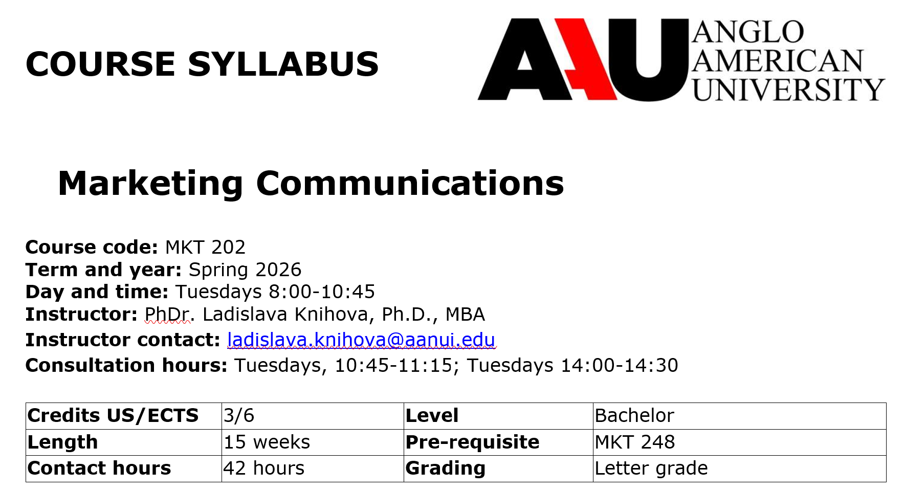 The course will be taught in a very interactive manner using current issues and having students analyze case studies, present a specific IMC plan for a chosen product or service, learn specific experiences from guest speakers and possibly attend a class trip to a marketing-related event or company to make the subject as relevant and understandable as possible. Active participation in class discussions is highly supported and mandatory since training communication skills is crucial in the real marketing world. Specific projects will be in groups since almost all real media and marketing communication projects are coordinated in teams. Using computers and telephones during class is highly forbidden unless used for class purposes and specified by the teacher.